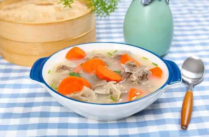 第一道是羊肉胡萝卜汤。羊肉性温,是冬季暖身的佳品,能快速驱散体内的寒气。胡萝卜富含维生素和胡萝卜素,与羊肉搭配,不仅营养丰富,还能中和羊肉的膻味。