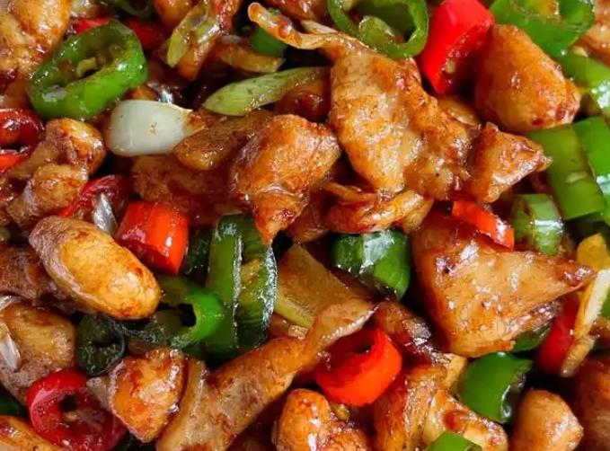 4、炒至线椒断生,鸡丁入味以后,即可出锅开吃。