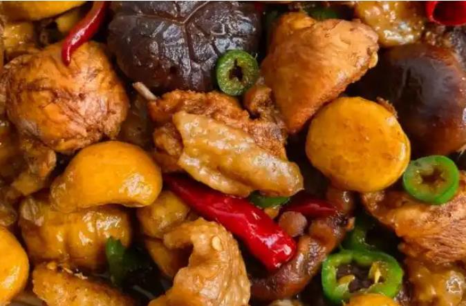 3、接着加入适量的料酒、生抽、蚝油、食盐和白糖调味提鲜,再加入板栗和香菇一起焖煮二十分钟。