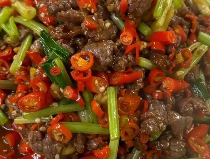 2、清洗干净芹菜切好,再切好其它配菜,接着热锅烧油,油热以后,放入黄牛肉煸炒滑熟,然后盛出备用。