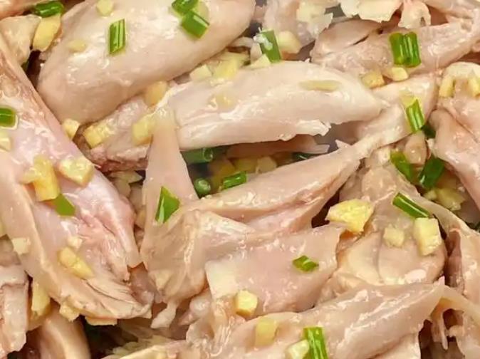 1、鸡腿清洗干净,然后冷水下锅焯煮,接着加入姜葱去腥,焯煮二十分钟后,再捞出撕成小块备用。