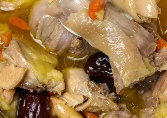 准备食材: 党参、黄芪、玉竹、麦冬、去核红枣、鸡肉、姜片、枸杞子。