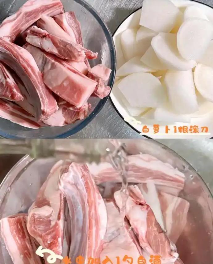 食材准备:羊肋排2斤、白萝卜一根切成滚刀块。